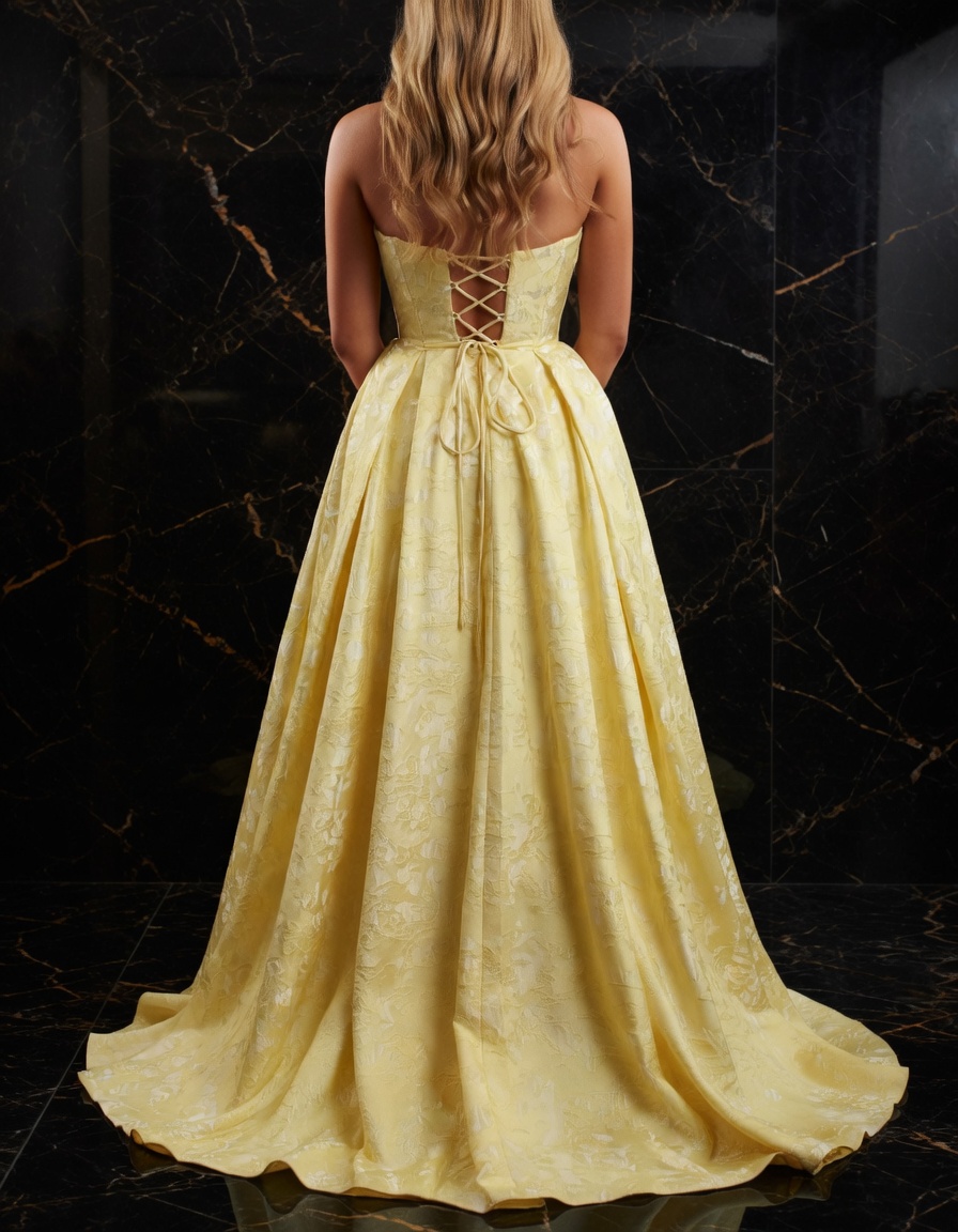 & Free ShippingA radiant masterpiece of volume and texture, the Canary Empress is crafted from embossed silk jacquard, featuring a precision-tailored sweetheart corset and a dramatic, high-slit pleated skirt for a regal summer presence.