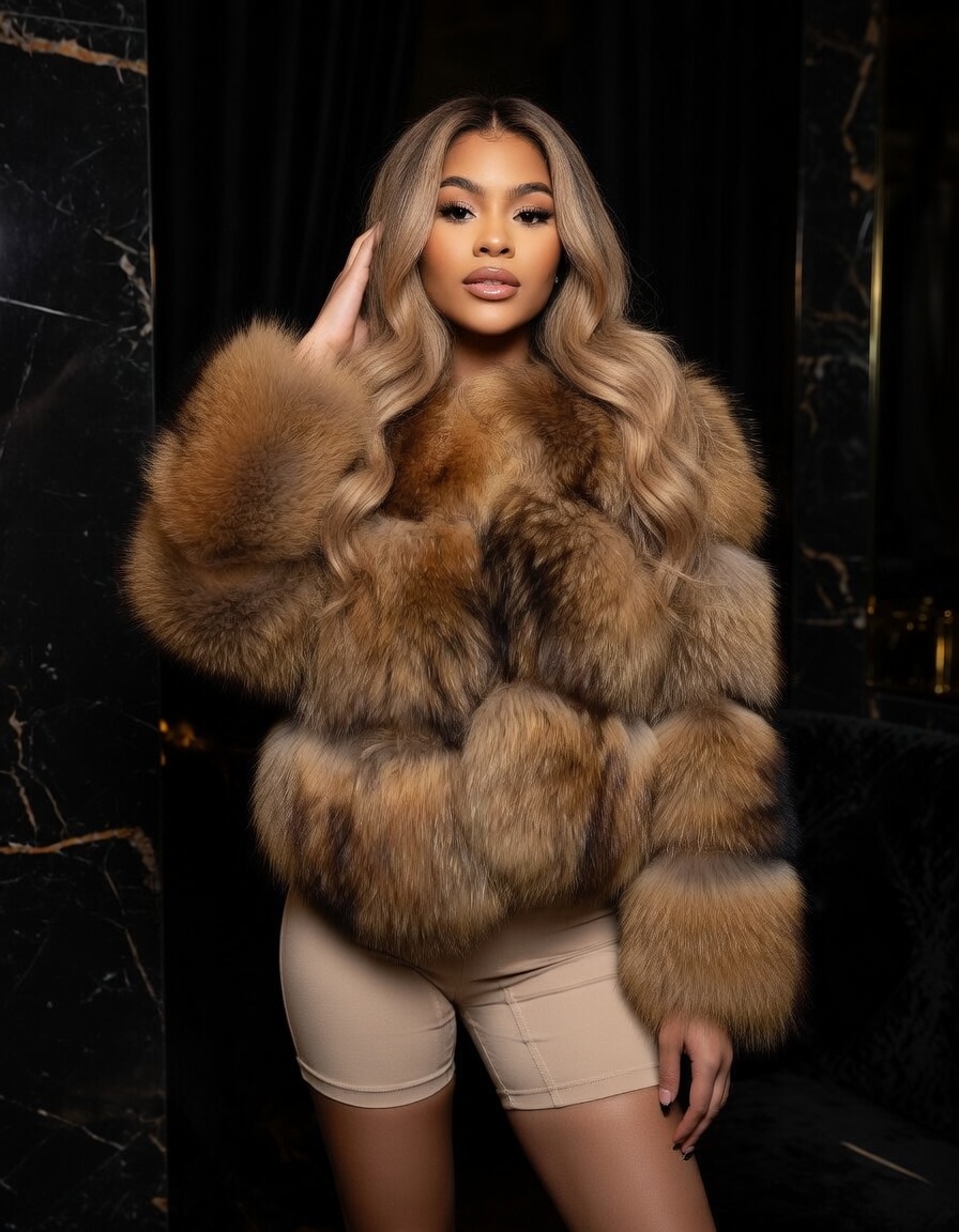 The natural luster of the fox pelts ensures a high-shine finish that transitions effortlessly from day to evening. This voluminous, cropped jacket is designed with a hidden front placket for a streamlined visual and padded interior structure for superior insulation. For the ultimate VÉRION aesthetic, layer it with the Taupe Sovereign Silk Set or a minimalist bodysuit to maximize the silhouette’s impact.