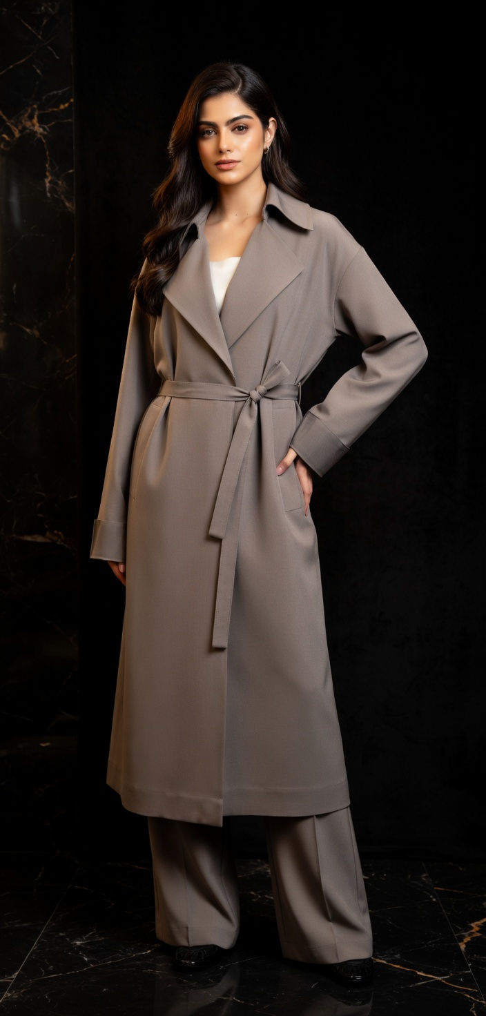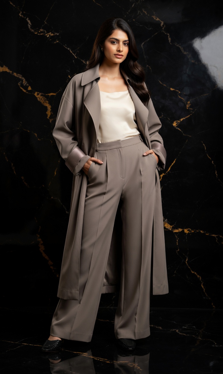 The epitome of relaxed opulence, the Taupe Sovereign set features a floor-grazing duster, high-waisted wide-leg trousers, and a silk camisole—engineered for the woman who commands respect without raising her voice.